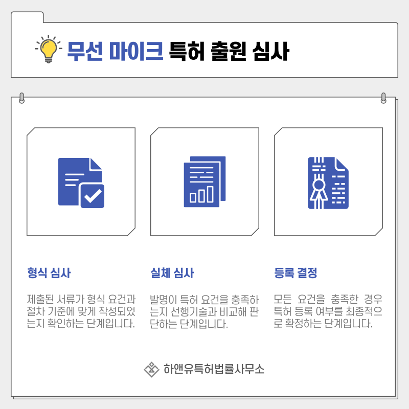 심사관은 기존 무선 마이크나 녹음 장비와 비교하여 신규성, 진보성 등을 검토합니다.
