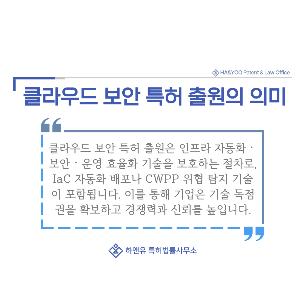 특히 IaC 기반의 인프라 관리나 CWPP의 보안 제어 기술은 모방 위험이 높기 때문에, 특허 등록을 통해 경쟁사의 복제나 기술 유출을 방지할 수 있습니다.