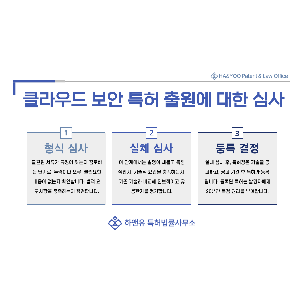 이 단계에서는 신규성, 진보성, 산업적 이용가능성을 중심으로 출원된 클라우드·보안 기술이 특허 요건을 충족하는지 판단합니다.