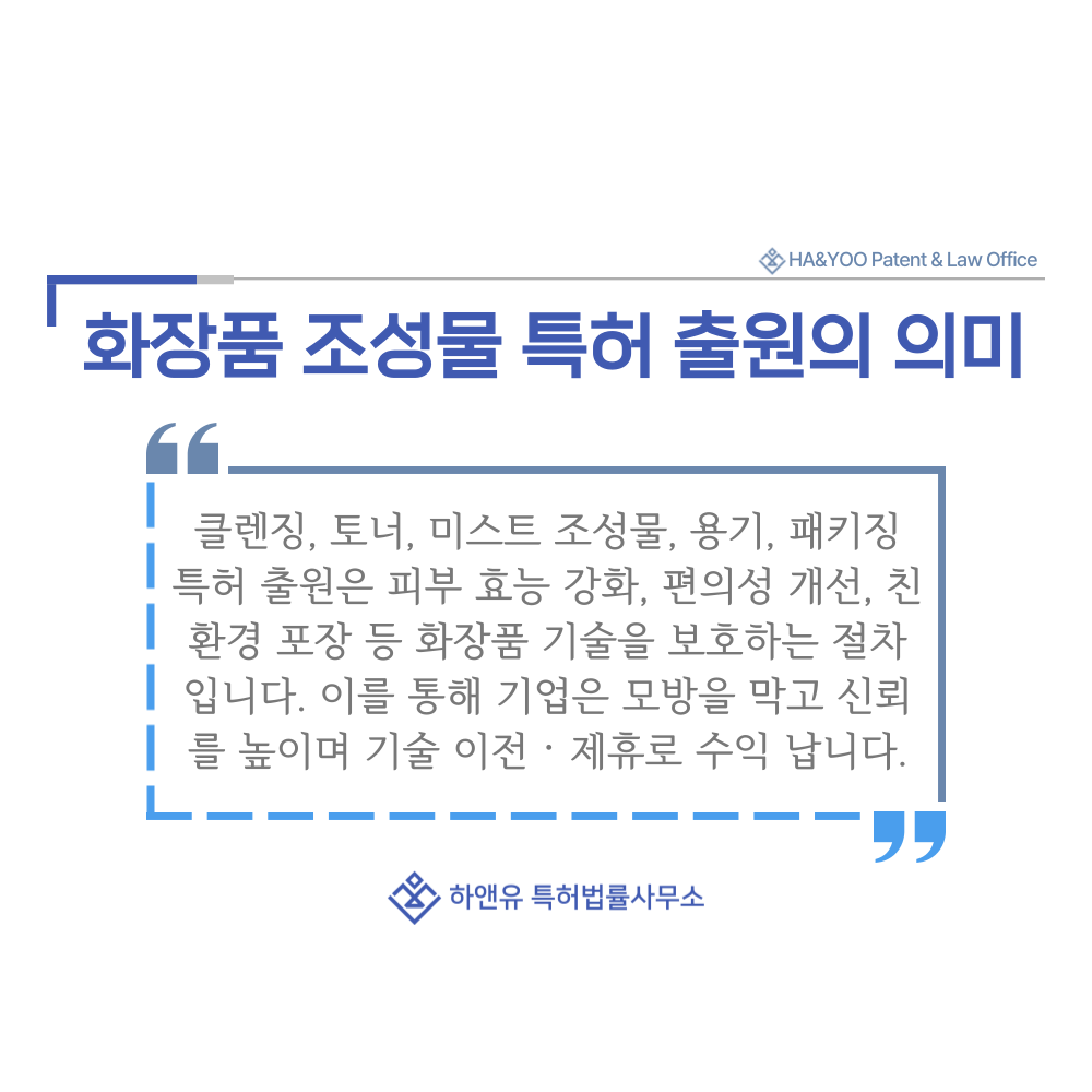 이로써 클렌징, 토너, 미스트 조성물과 용기·패키징 기술은 법적으로 보호받으며, 기업은 독점적 권리를 확보해 안정적인 사업 운영과 경쟁 우위를 지킬 수 있습니다.