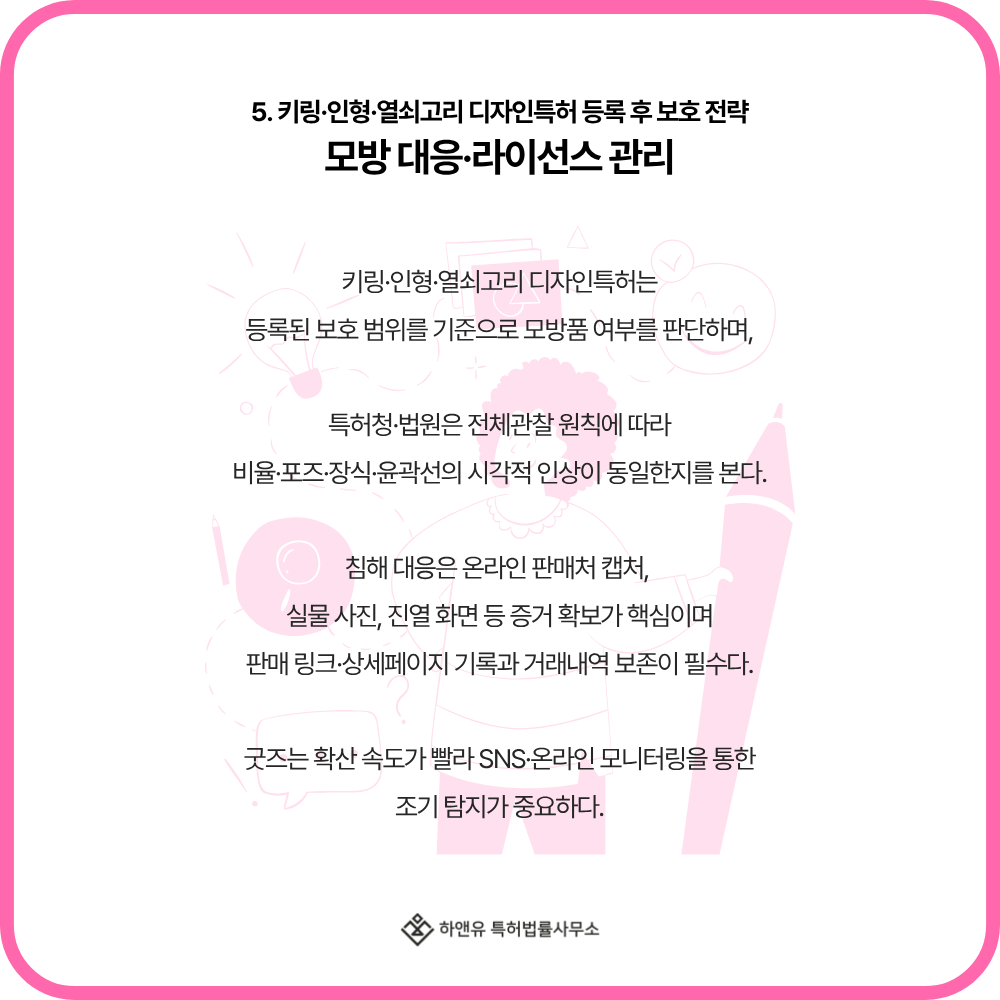 5. 키링·인형·열쇠고리 디자인특허 등록 후 보호 전략|모방 대응·라이선스 관리
