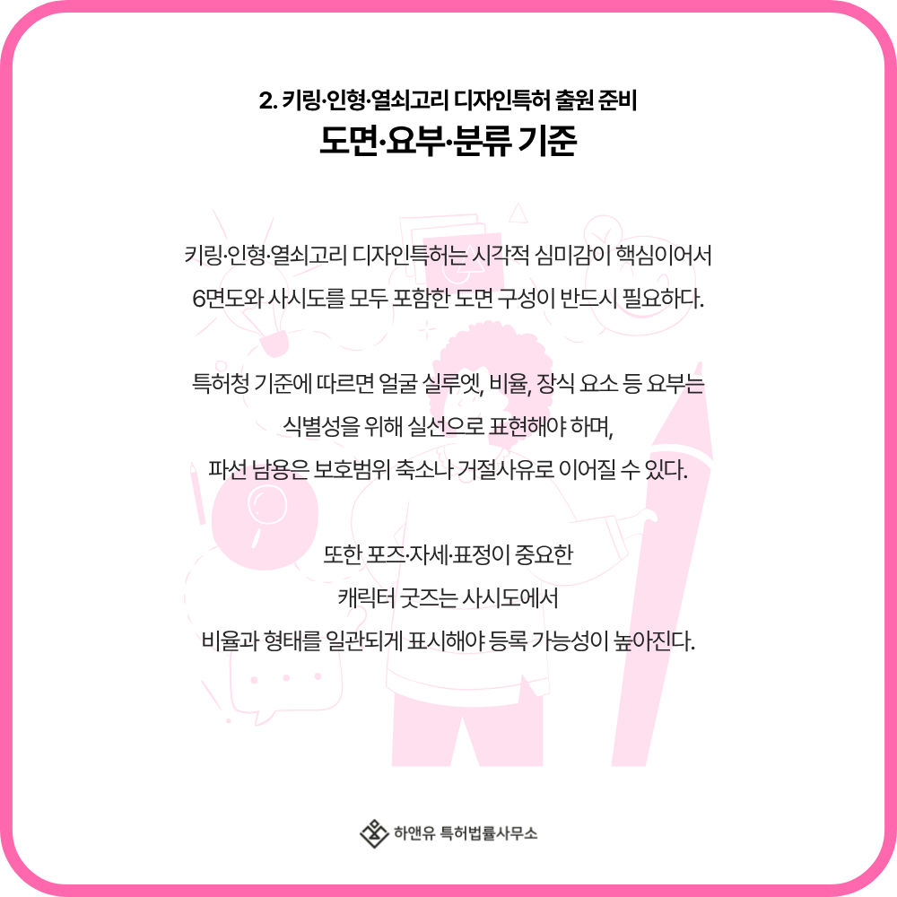 특허청(지식재산처) 심사 기준에 따르면 인형·키링류는 요부(디자인의 핵심 특징)가 명확히 표현되어야 하며,