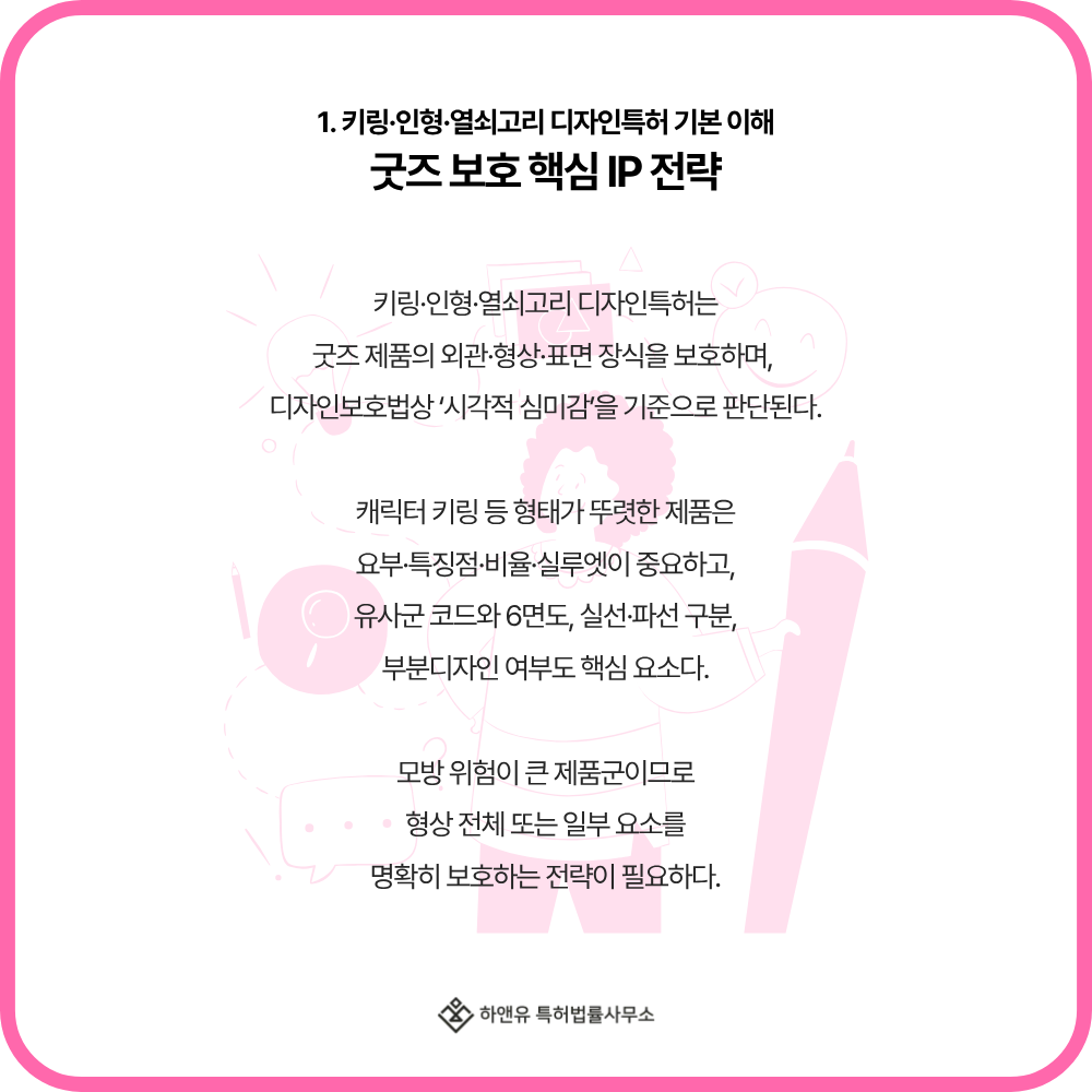 결과적으로 디자인특허는 굿즈 라인업을 장기적으로 운영하기 위한 브랜드·캐릭터·콜라보 IP 관리의 핵심 도구로 기능합니다.