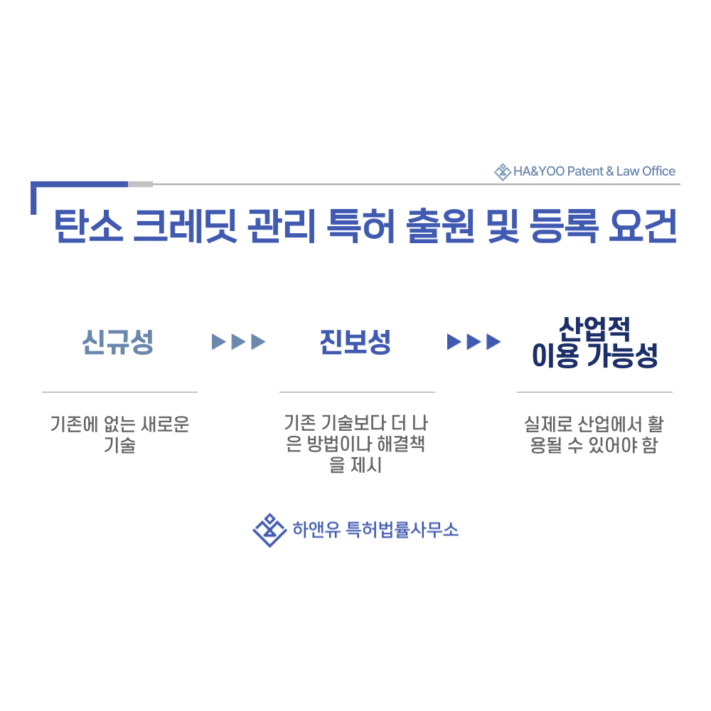 배출량 계산 방식, 데이터 수집 구조, 검증 자동화 시스템 등이 기존 기술보다 정밀하고 효율적일 때 특허로 인정됩니다.
