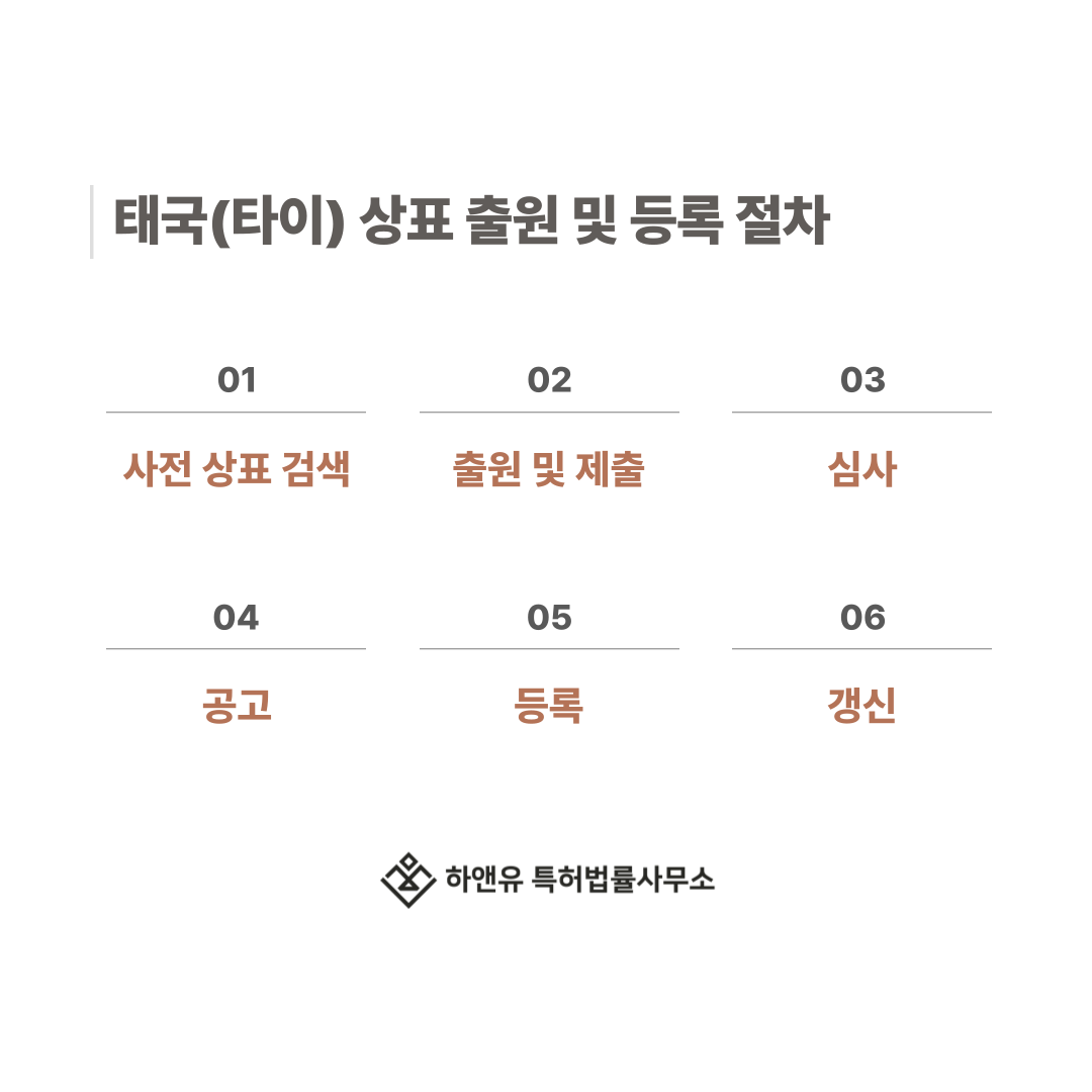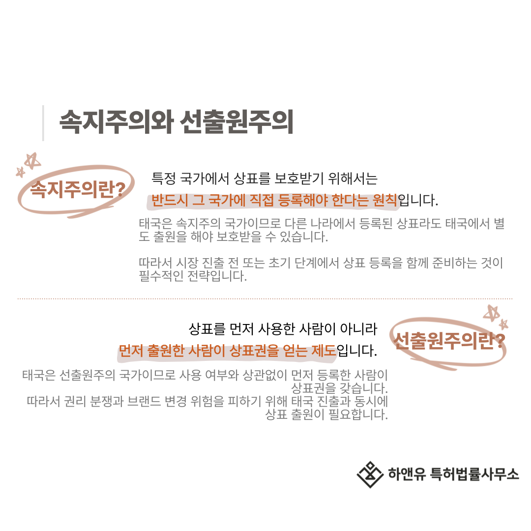 태국은 선출원주의 국가로, 먼저 사용한 사람이 아닌 먼저 출원한 사람이 상표권을 우선적으로 취득합니다.