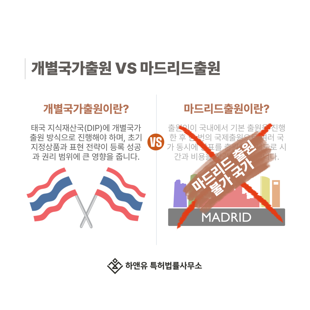 태국 시장 규모나 진출 계획, 상표 전략에 따라 개별출원과 마드리드 방식 중 적합한 방식을 선택하는 것이 효율적입니다.