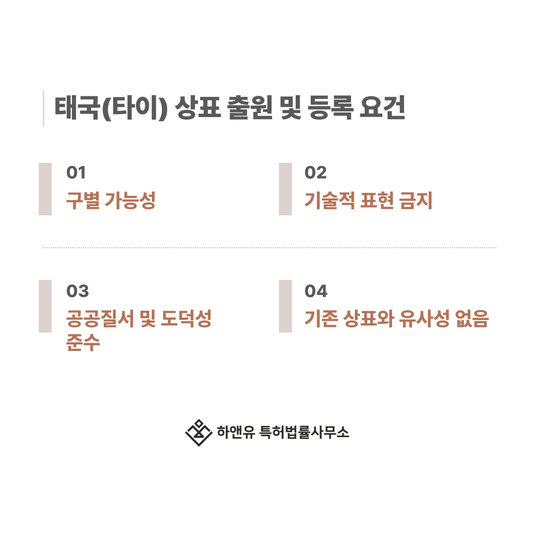 태국은 기존 등록된 상표와 혼동될 가능성이 있는 상표는 등록할 수 없습니다.