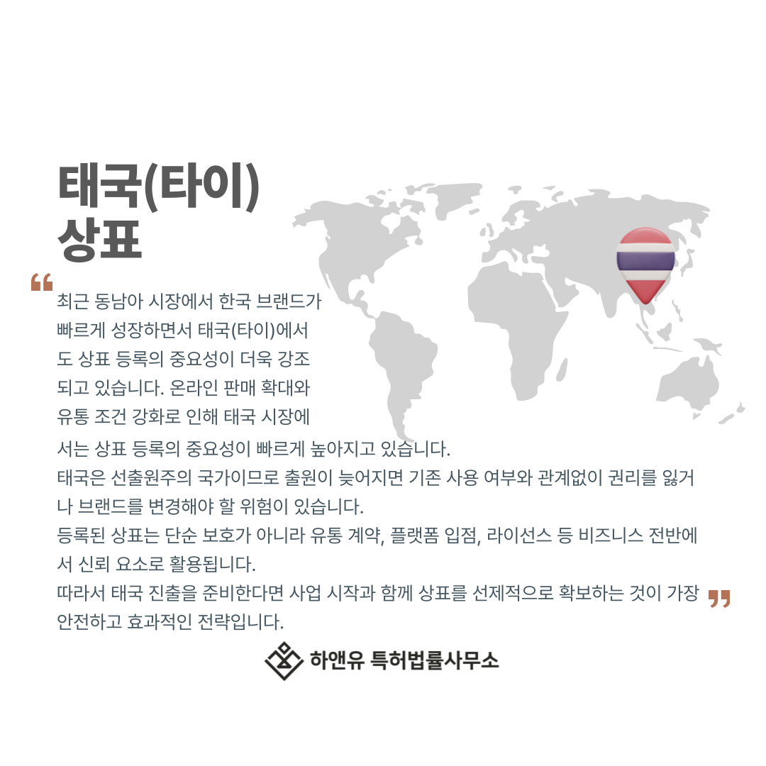 최근 동남아 시장에서 한국 브랜드가 빠르게 성장하면서 태국(타이)에서도 상표 등록의 중요성이 더욱 강조되고 있습니다.