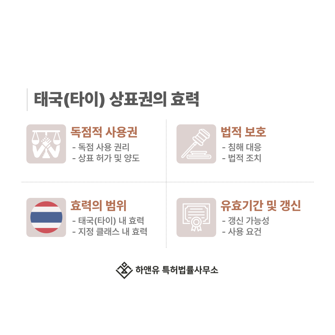 태국 상표권의 효력은 등록 시 지정한 상품 및 서비스 범위 내에서만 적용됩니다.