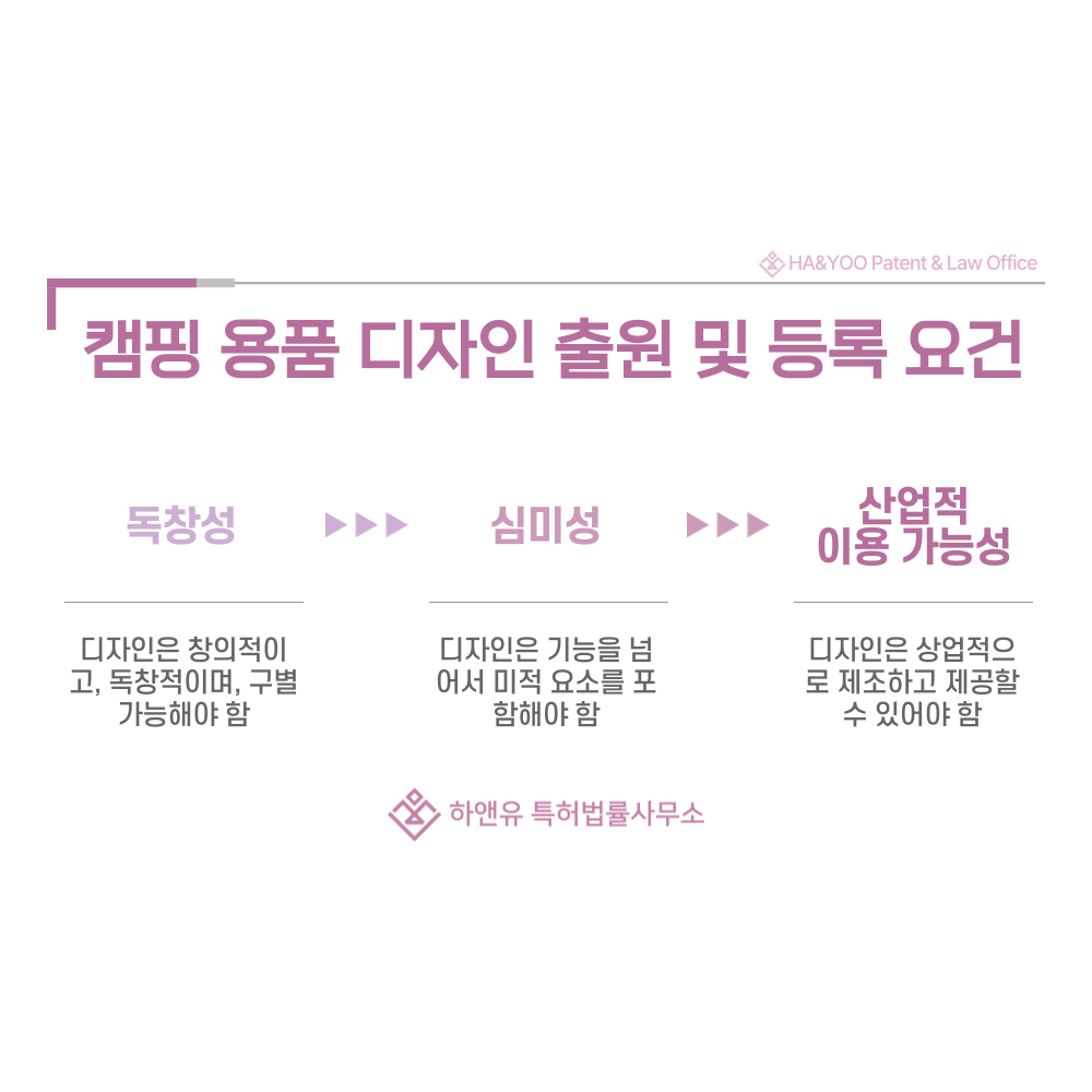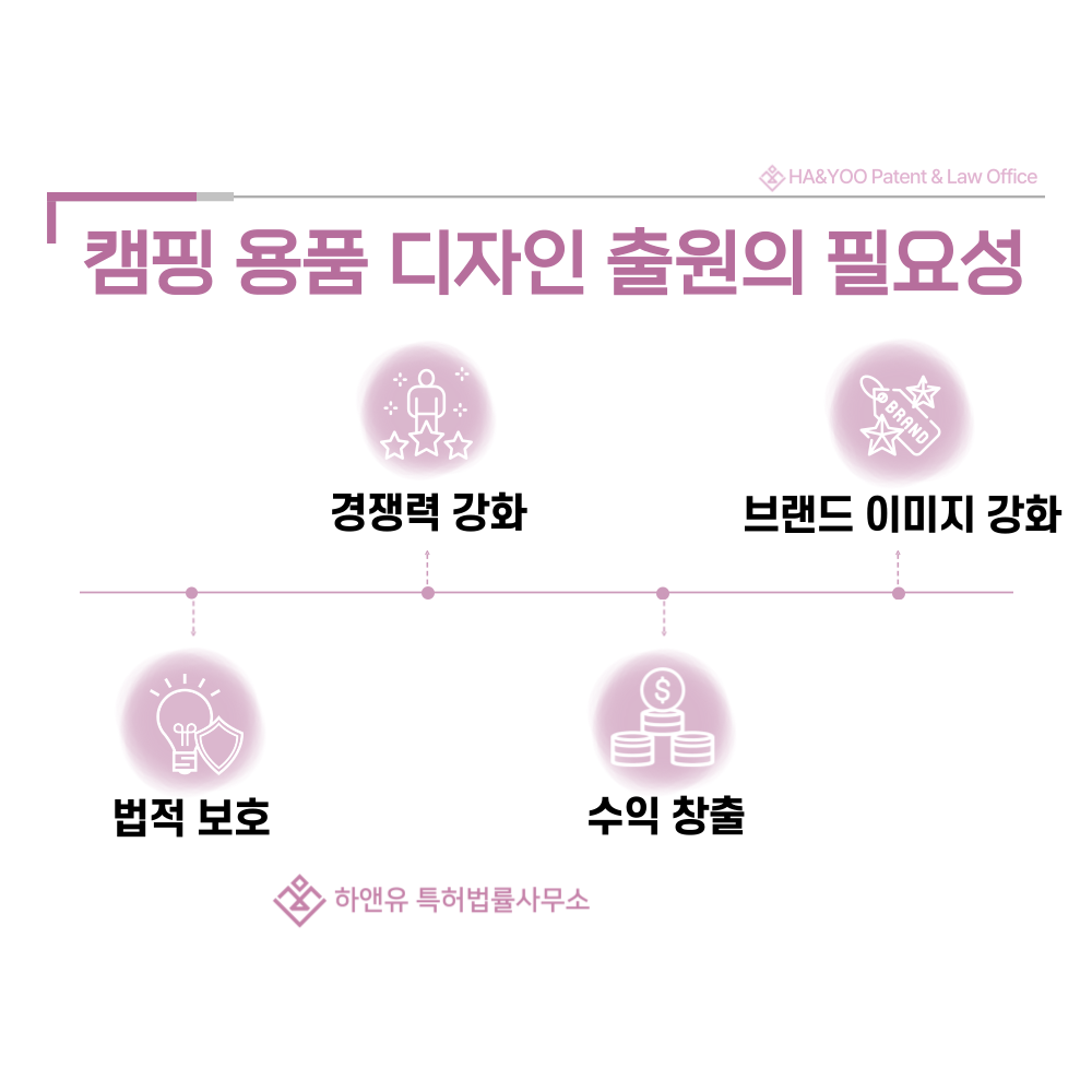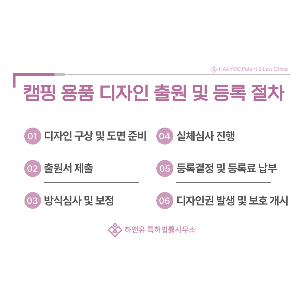 따라서 디자인권은 텐트, 타프, 침낭, 버너 등 캠핑용품 시장에서 장기적 경쟁력을 유지하는 핵심적인 법적 자산이 됩니다.