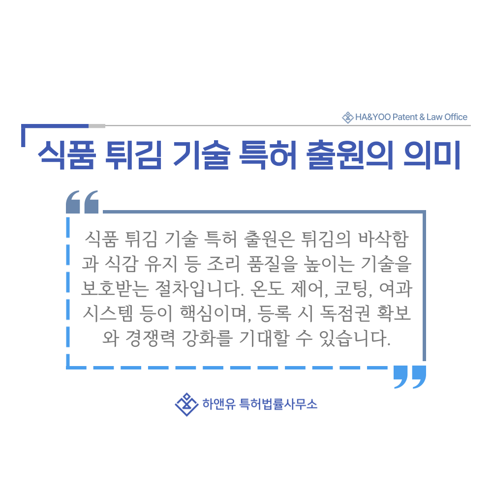 즉, 튀김 기술의 특허 출원은 기업이 오랜 시간 축적한 기술과 품질 경쟁력을 법적으로 지켜내는 가장 확실한 방법입니다.
