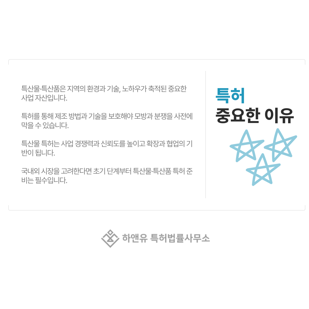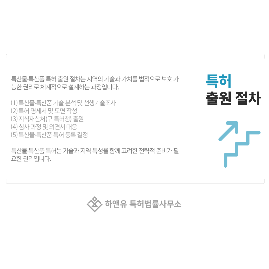 #특산물특허 #특산품특허 #특산물특허출원 #특산품특허등록 #지역특산물특허 #특허출원절차 #특허전문변리사 #지식재산권 #해외출원전문 #특허출원 #특허등록 #특허권 #PatentRegistration #PatentApplication #특허사무소 #특허법률사무소 #하앤유특허법률사무소