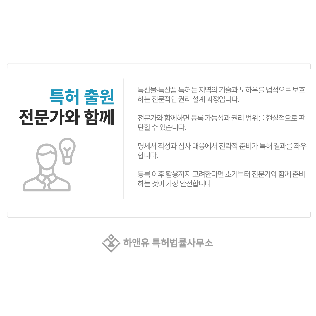 특산물 특허를 고민하고 계시다면 처음부터 전문가와 함께 준비하는 것이 가장 안전한 선택입니다.