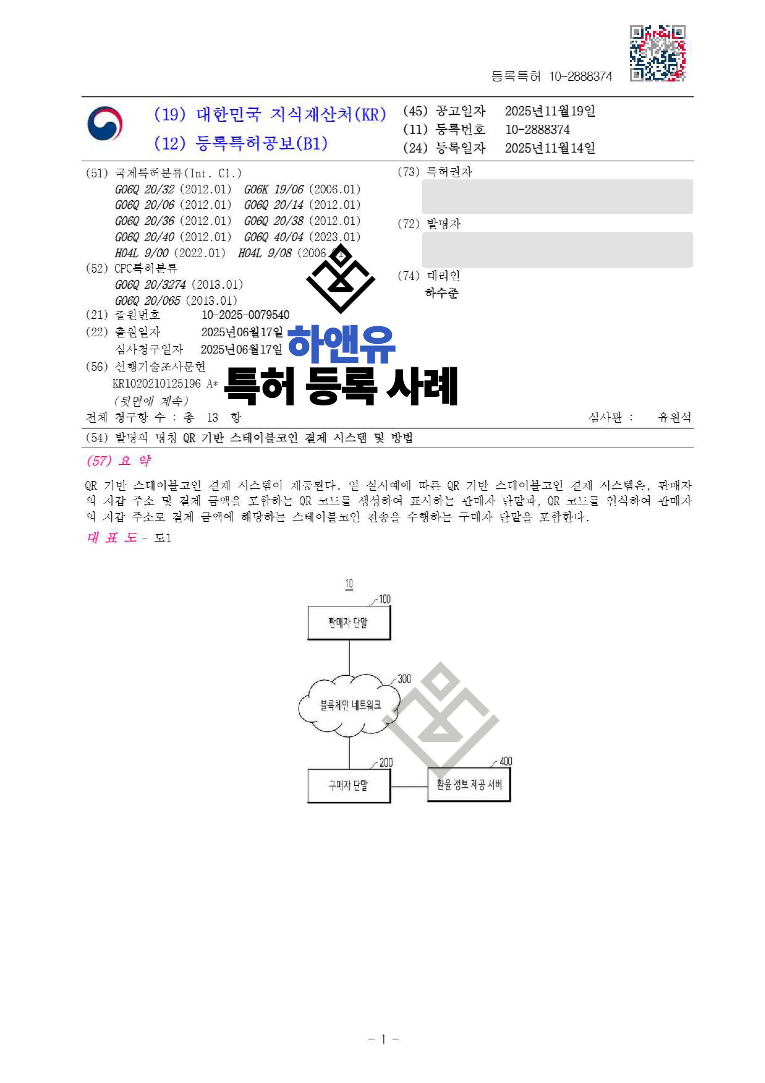 하앤유특허법률사무소에서 QR 기반 스테이블코인 결제 시스템 및 방법 특허를 성공적으로 등록하였습니다.