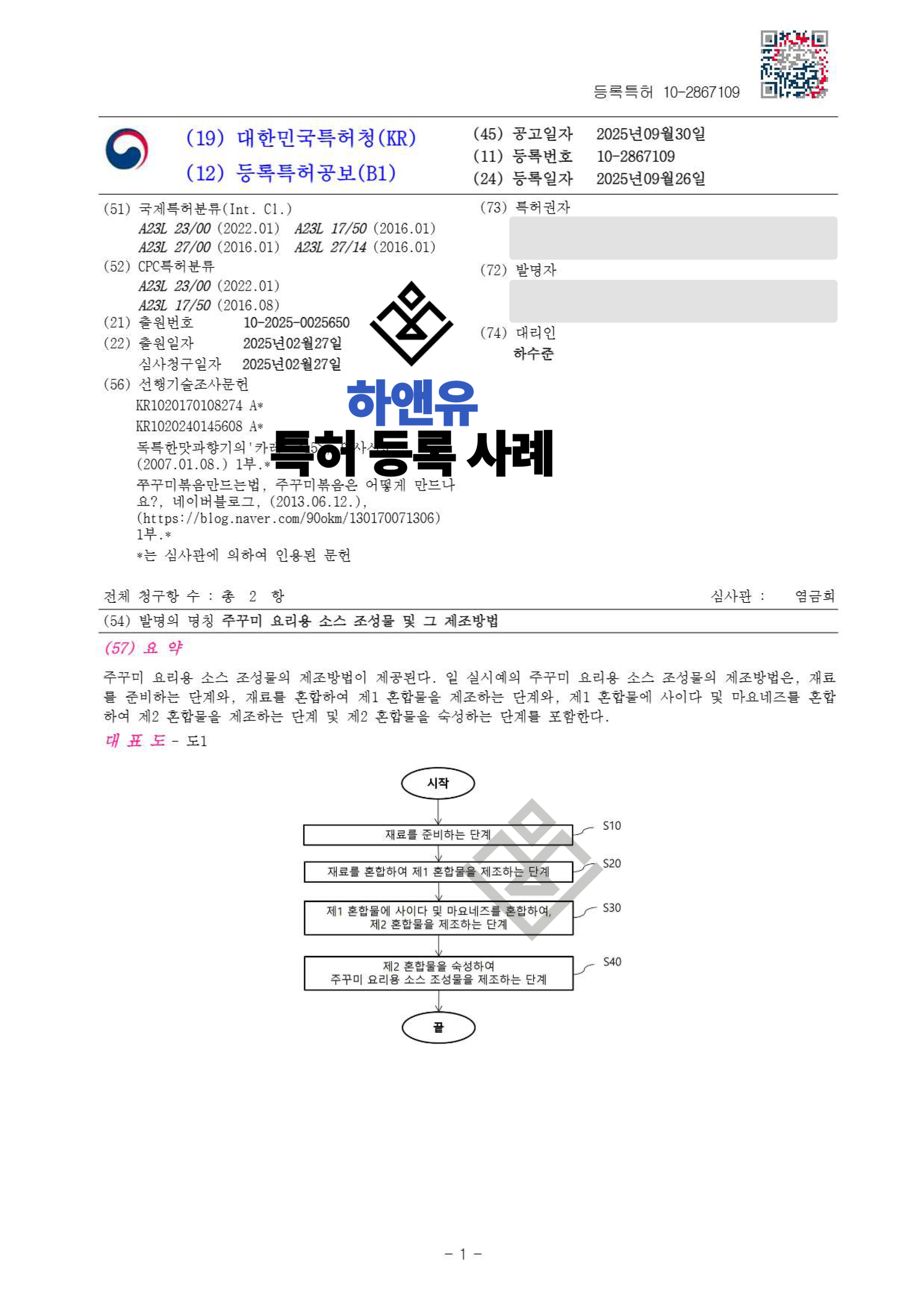 #식품소스특허 #소스조성물특허 #식품조성물특허 #식품특허 #요리소스특허 #식품제조방법특허 #특허출원 #특허등록 #특허권 #특허등록사례 #PatentRegistration #PatentApplication #특허사무소 #특허법률사무소 #하앤유특허법률사무소