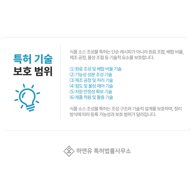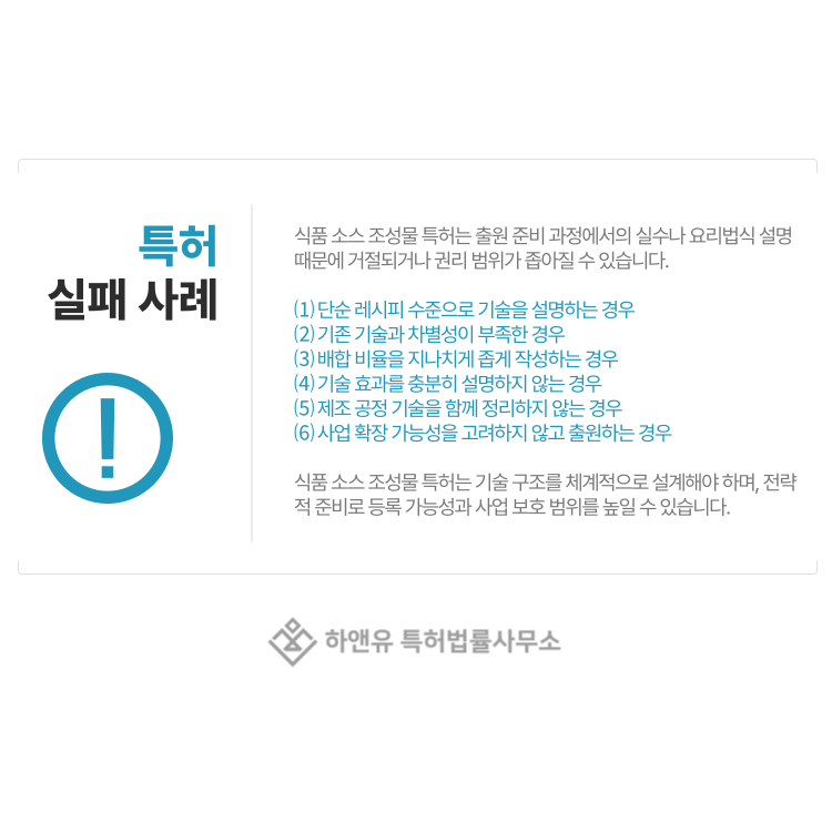 이처럼 식품 소스 조성물 특허는 단순한 레시피 보호가 아니라 기술 구조를 체계적으로 설계하는 과정이 필요합니다.