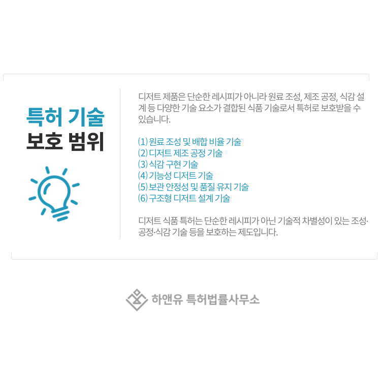 하지만 디저트 식품 특허는 단순한 요리법을 보호하는 제도가 아니라 기술 구조를 보호하는 제도입니다.