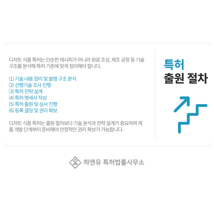 디저트 식품 특허 출원 절차는 비교적 단순해 보일 수 있지만 실제로는 기술 분석과 전략 설계가 매우 중요한 과정입니다.