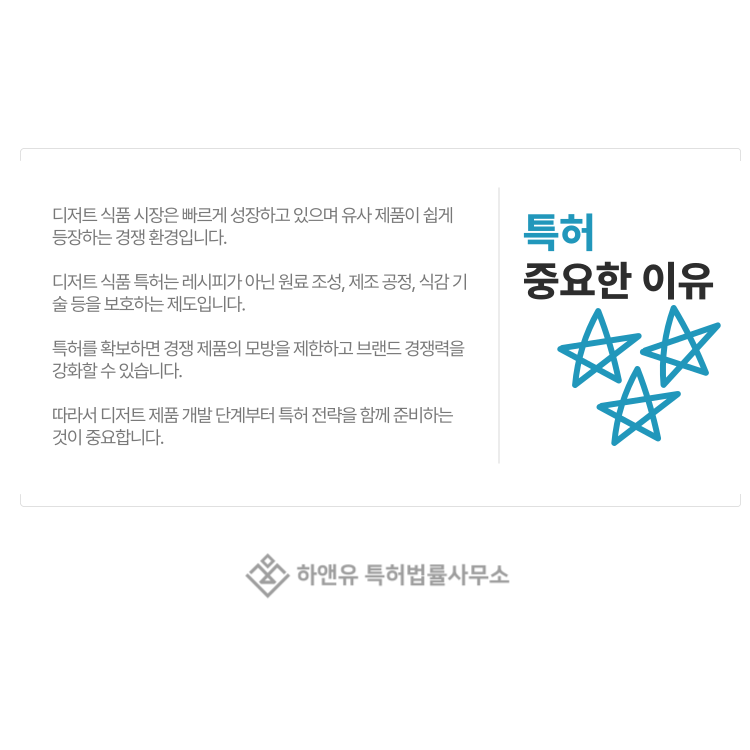 이처럼 디저트 식품 특허는 단순한 레시피 보호가 아니라 다양한 기술 요소를 보호하는 제도입니다.