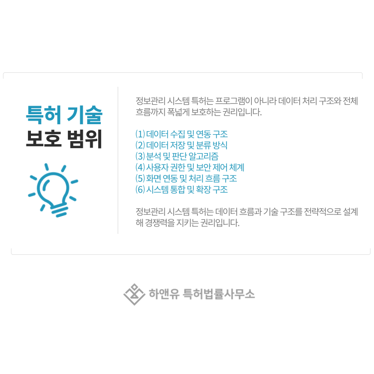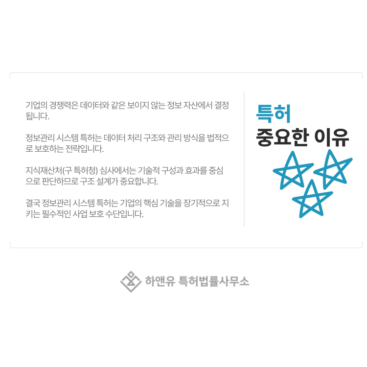 결국 정보관리 시스템 특허는 기능 나열이 아니라 데이터 흐름과 기술 구조를 보호하는 권리입니다.