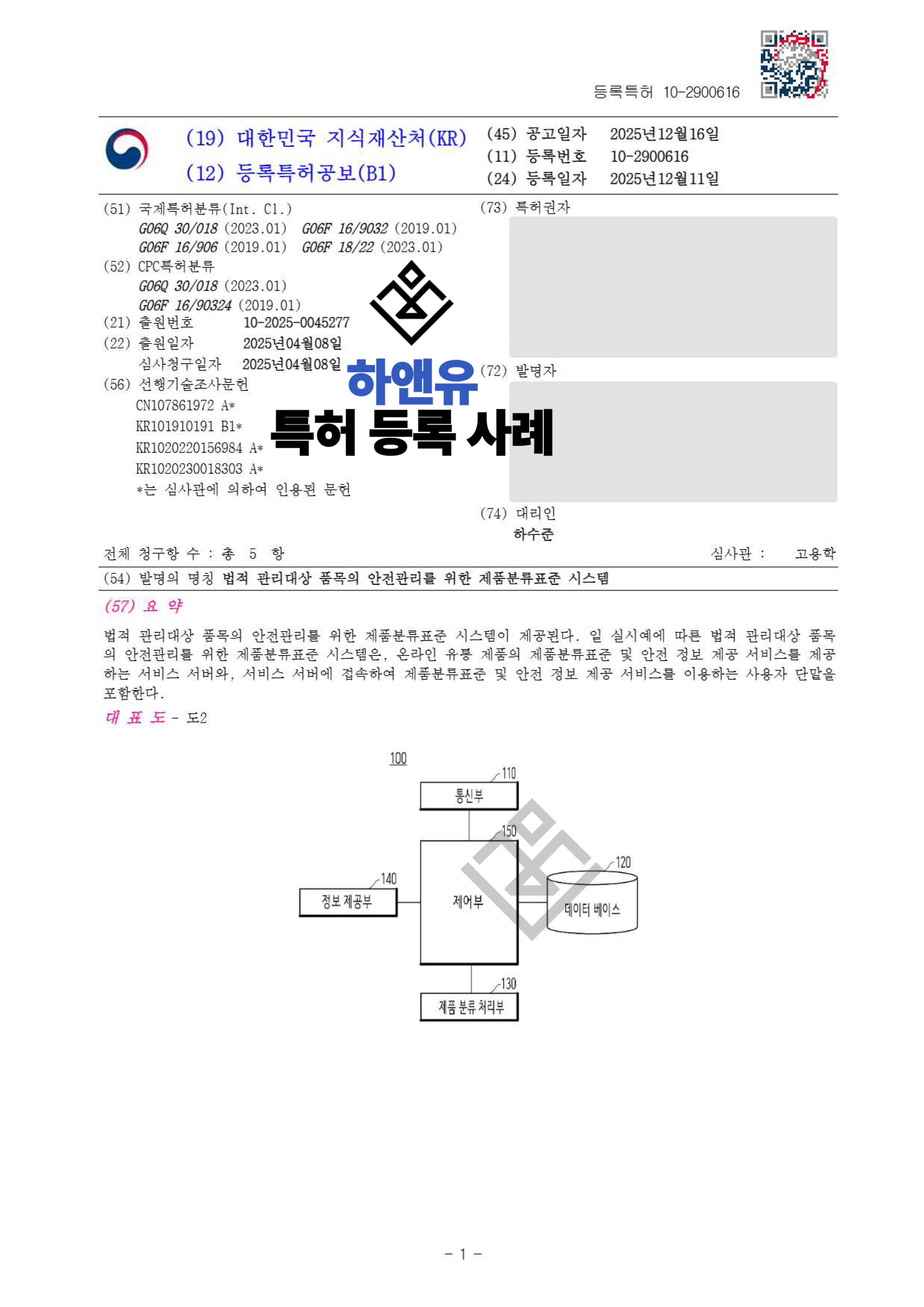 하앤유특허법률사무소에서 법적 관리대상 품목의 안전관리를 위한 제품분류표준 시스템 특허를 성공적으로 등록하였습니다.
