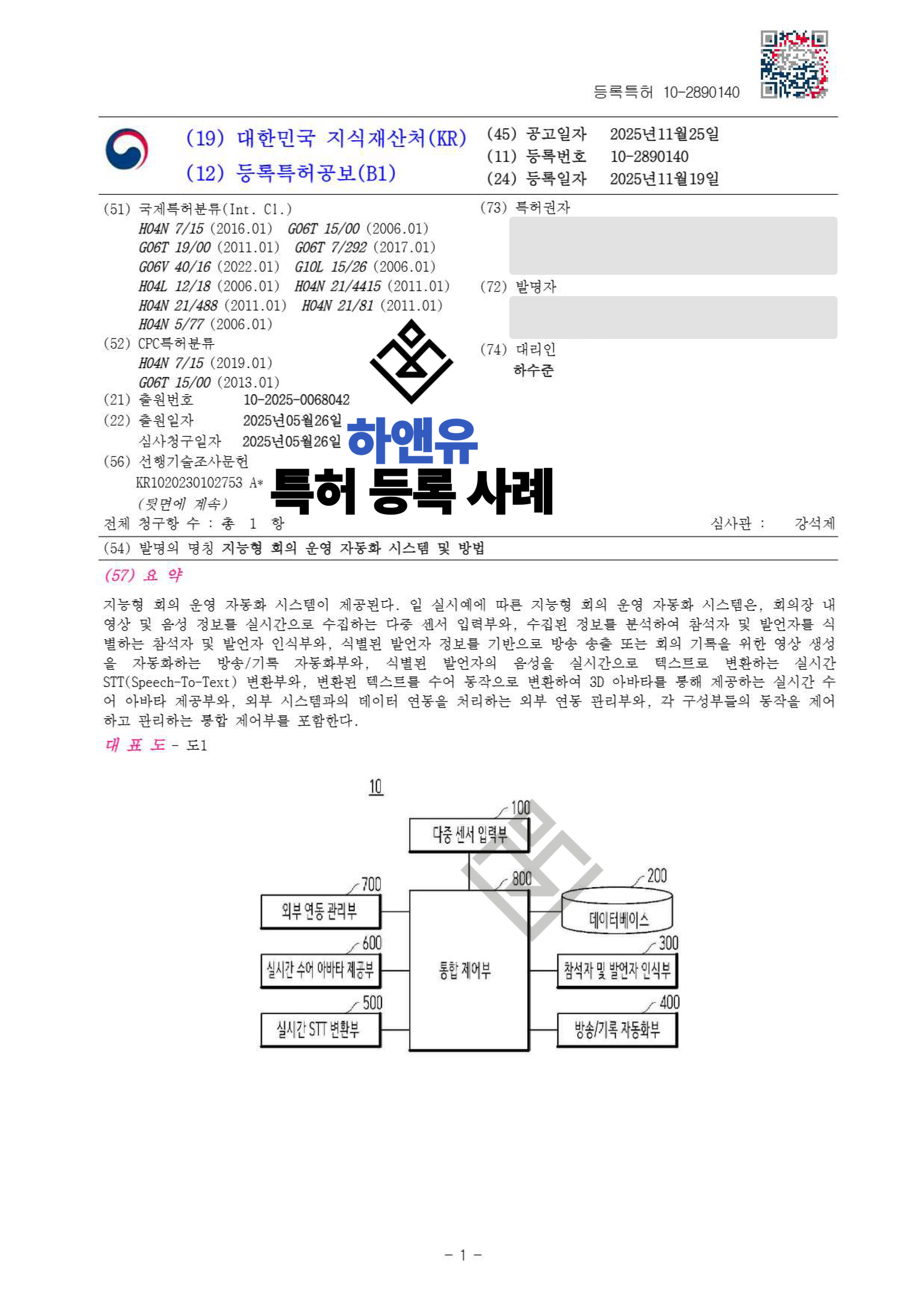 하앤유특허법률사무소에서 지능형 회의 운영 자동화 시스템 및 방법 특허를 성공적으로 등록하였습니다.