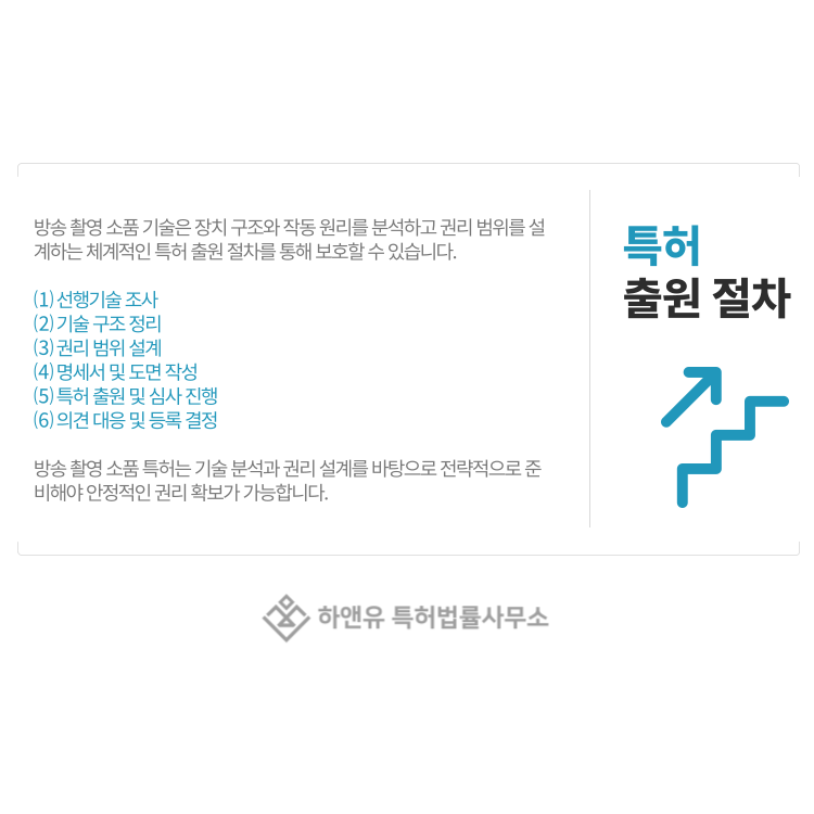 이처럼 방송 촬영 소품 특허 출원은 기술 분석부터 권리 설계, 심사 대응까지 여러 단계가 체계적으로 진행되는 과정입니다.