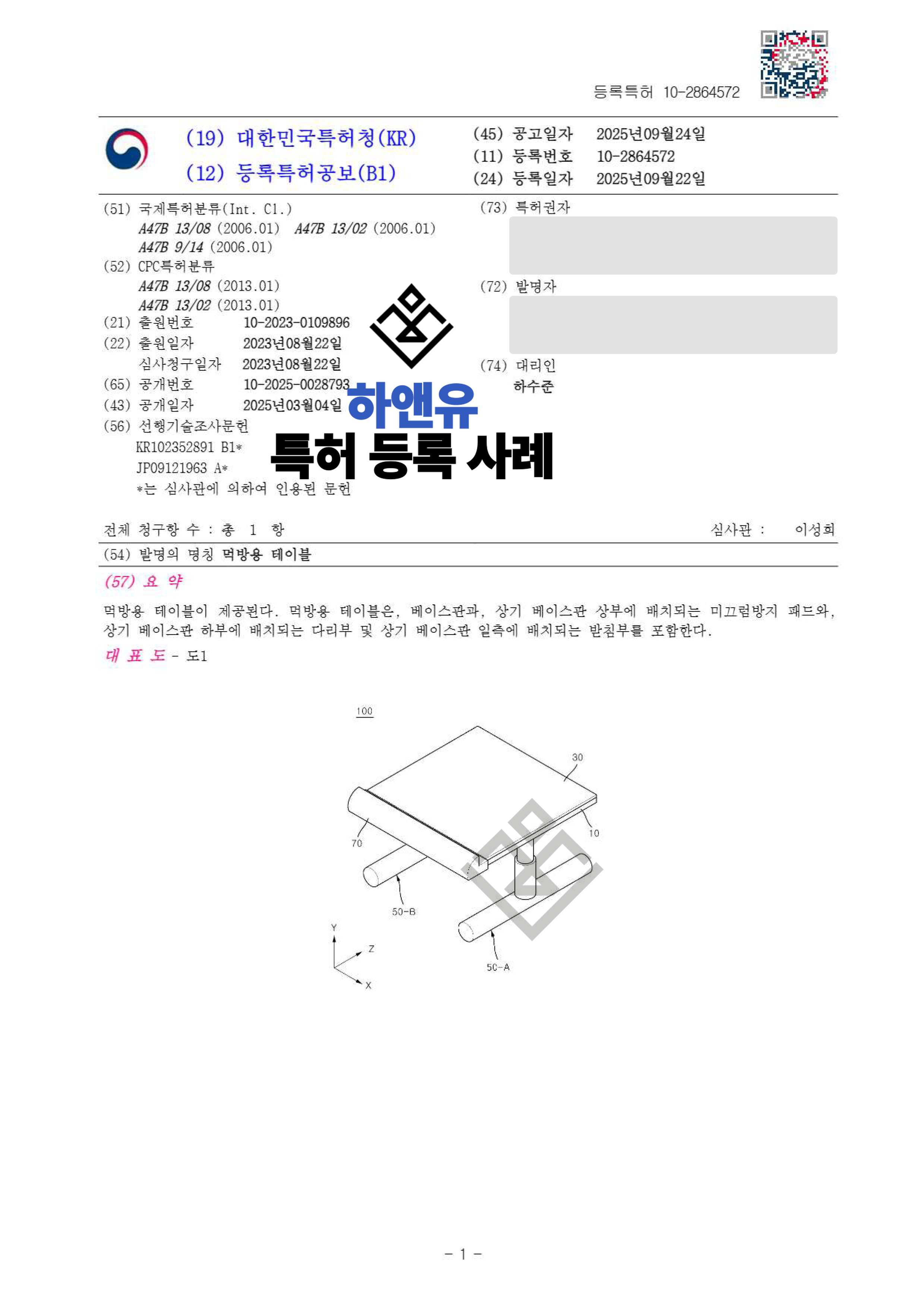 하앤유특허법률사무소에서 먹방용 테이블 특허를 성공적으로 등록하였습니다.