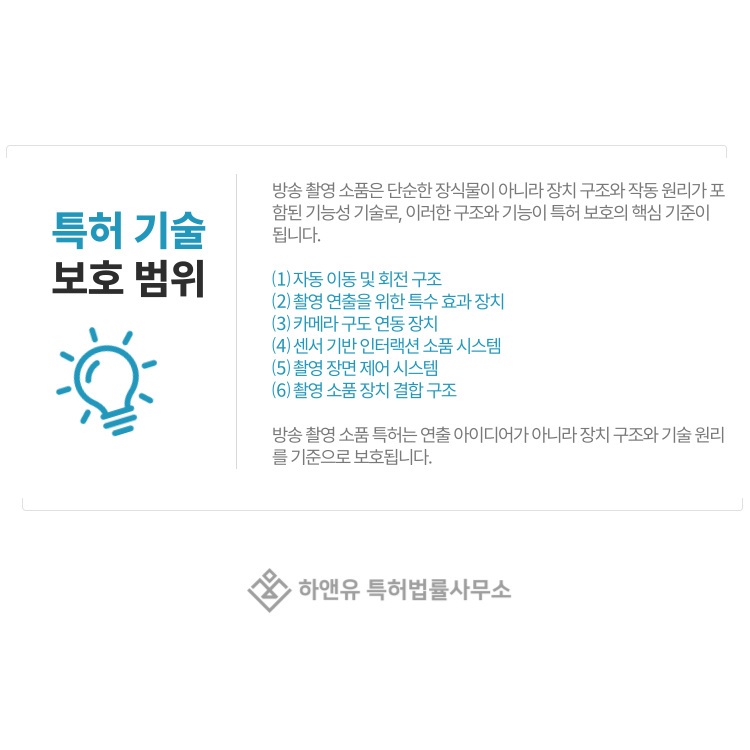 이처럼 방송 촬영 소품 특허는 단순한 아이디어 출원이 아니라 기술 구조와 권리 범위를 전략적으로 설계하는 과정이 필요합니다.