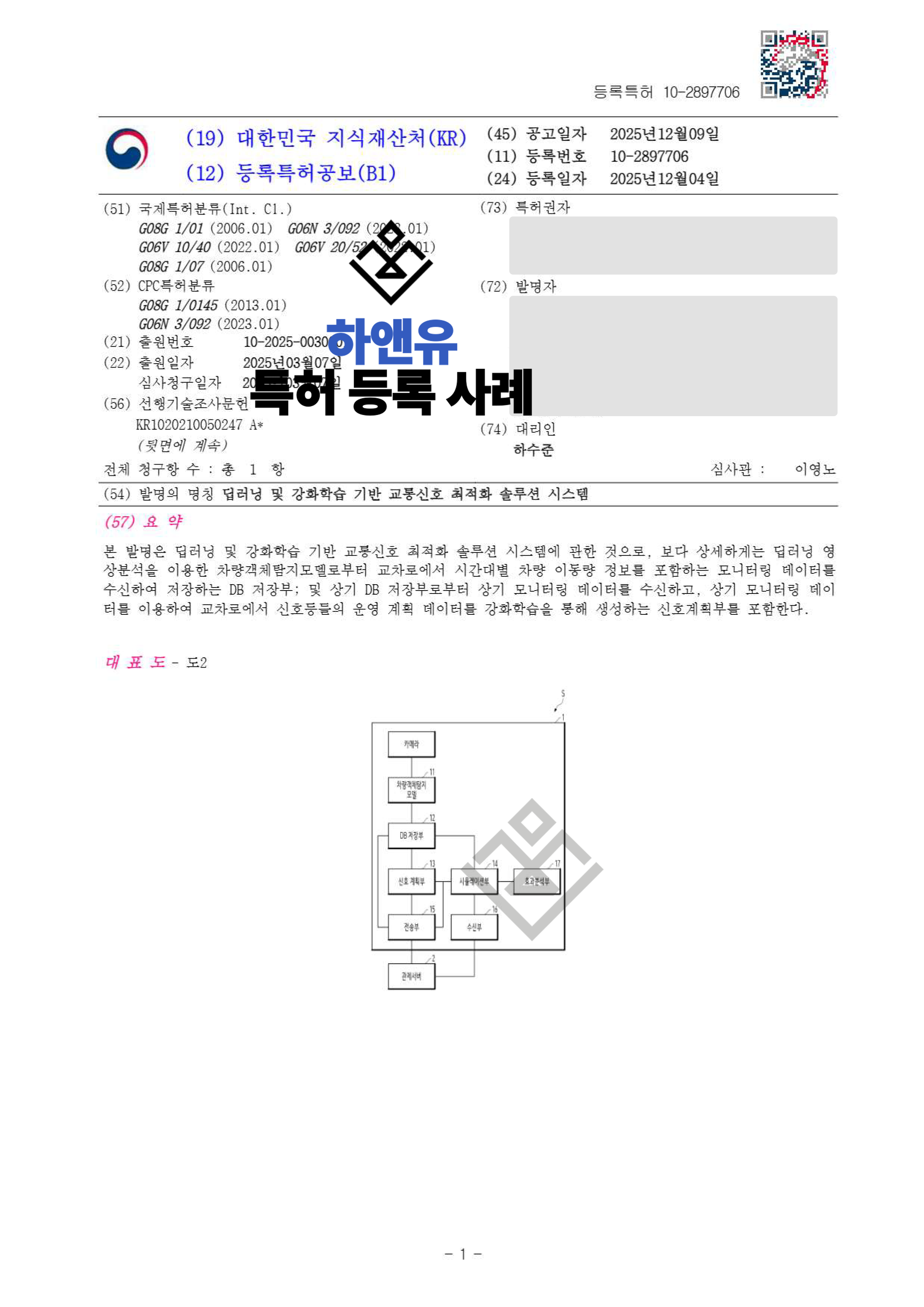 이번 등록을 통해 AI 기반 교통신호 최적화 기술의 구조적 차별성과 안정성이 법적으로 보호받게 되었습니다.