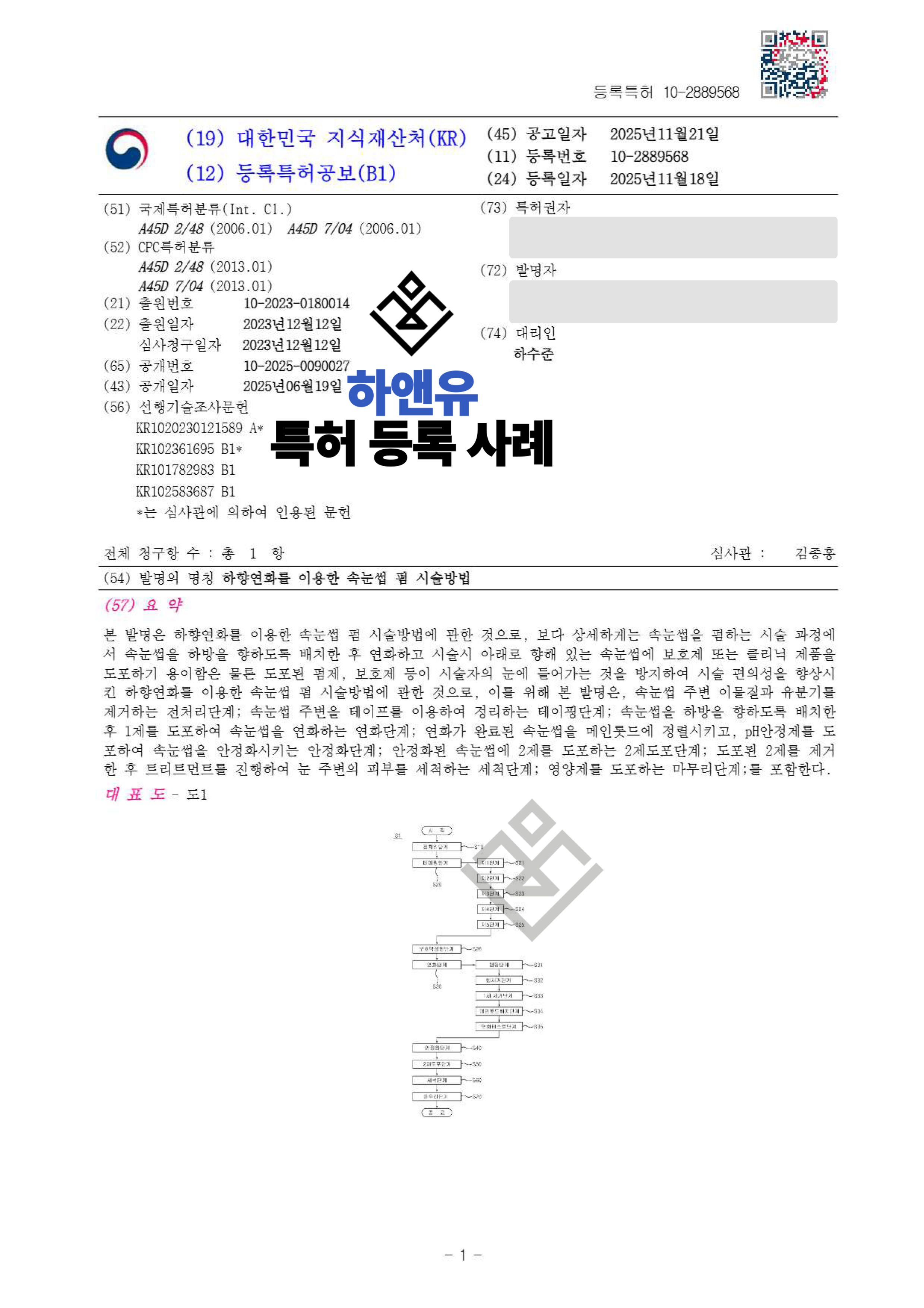 하앤유특허법률사무소에서 하향연화를 이용한 속눈썹 펌 시술방법 특허를 성공적으로 등록하였습니다.