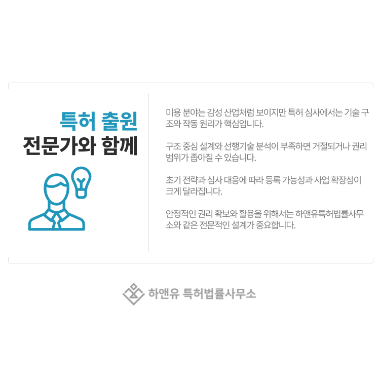 하앤유특허법률사무소는 미용 기술의 구조적 차별성을 정교하게 설계하여 안정적인 권리로 완성하였습니다.