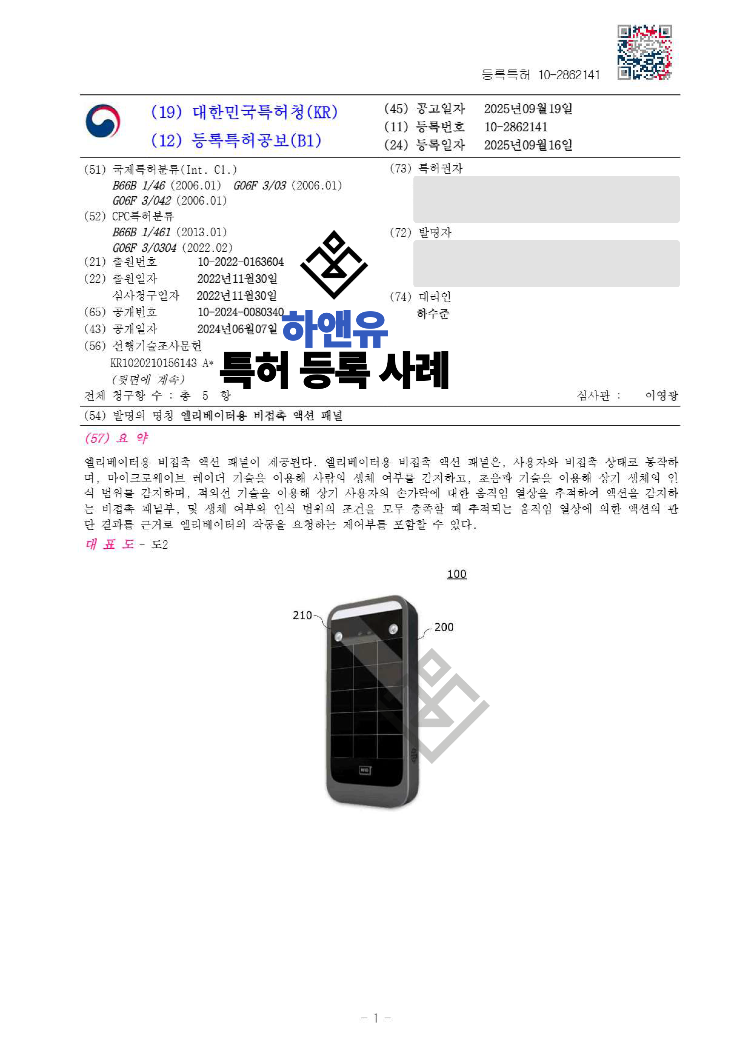 하앤유특허법률사무소에서 엘리베이터용 비접촉 액션 패널 특허를 성공적으로 등록하였습니다.