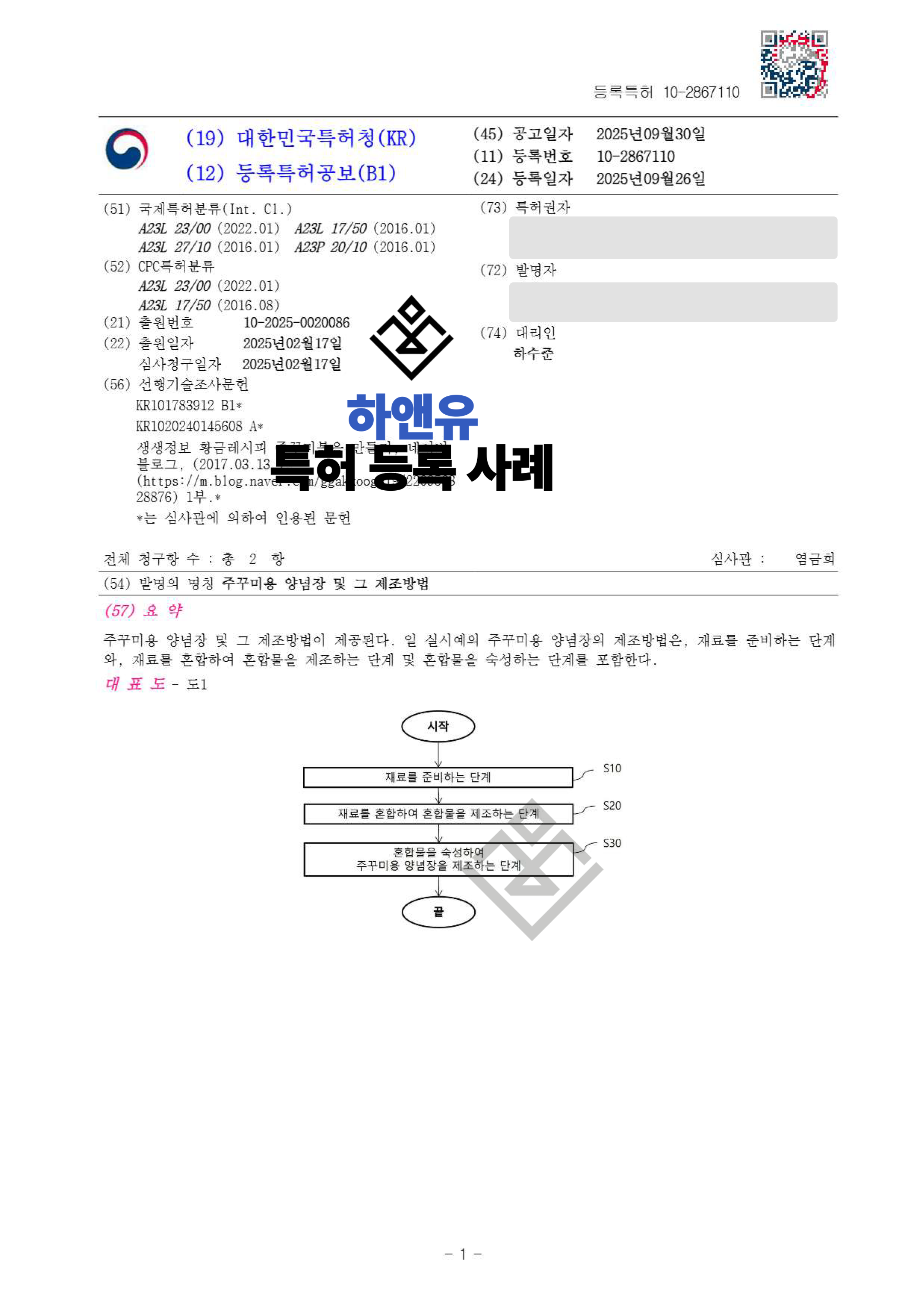 #주꾸미양념장특허 #주꾸미양념장및그제조방법 #해산물양념장특허 #양념장조성기술 #캡사이신함량조절 #양념점도조절기술 #식품조성물특허 #식품특허등록사례 #특허출원 #특허등록 #특허권 #특허등록사례 #PatentRegistration #PatentApplication #특허사무소 #특허법률사무소 #하앤유특허법률사무소