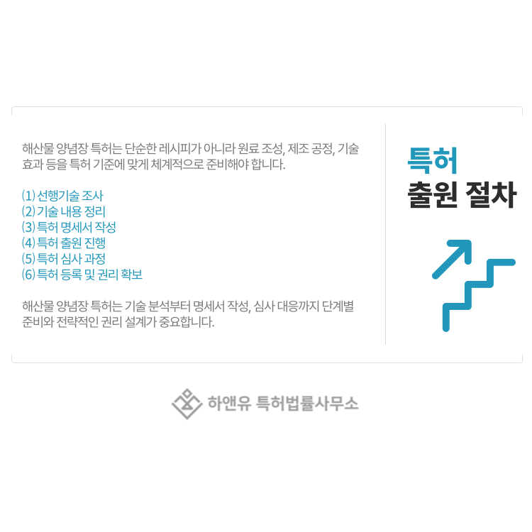 이러한 이유로 해산물 양념장 특허는 기술 분석부터 명세서 작성, 심사 대응, 권리 전략 설계까지 체계적인 준비가 필요합니다.