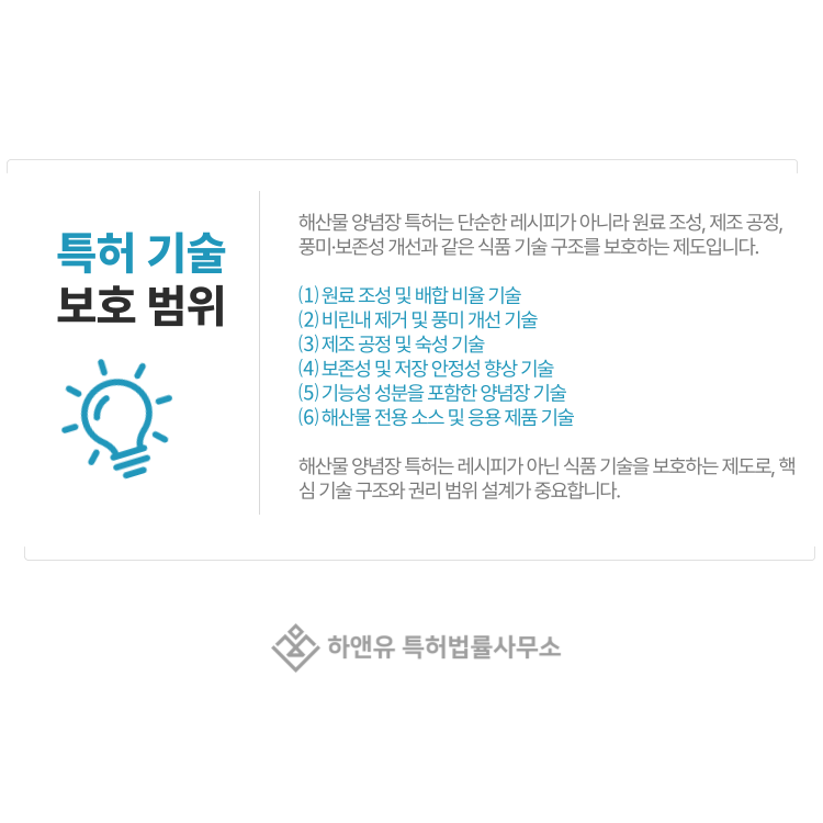 이처럼 해산물 양념장 특허는 단순한 레시피 보호가 아니라 다양한 식품 기술을 보호할 수 있는 제도입니다.