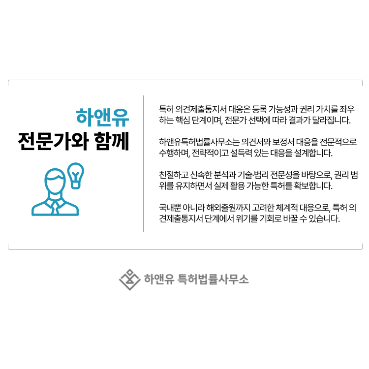 하앤유특허법률사무소는 특허 의견제출통지서, 의견서, 보정서 대응을 전문적으로 다루는 사무소입니다.