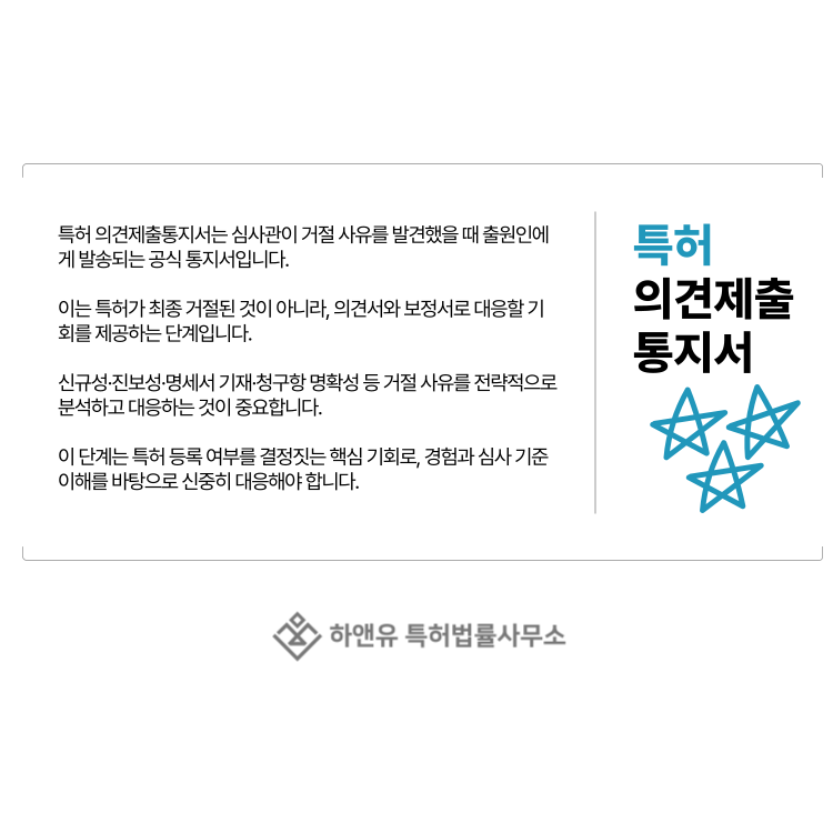따라서 특허 의견제출통지서는 특허 출원의 마지막 위기이자, 동시에 등록으로 이어질 수 있는 가장 중요한 기회라고 볼 수 있습니다.