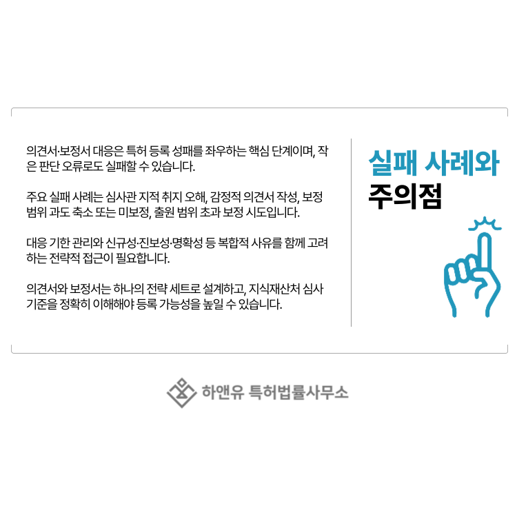 의견서·보정서 대응 실패 사례를 미리 알고 주의점을 지키는 것이 특허 등록으로 가는 가장 안전한 방법입니다.