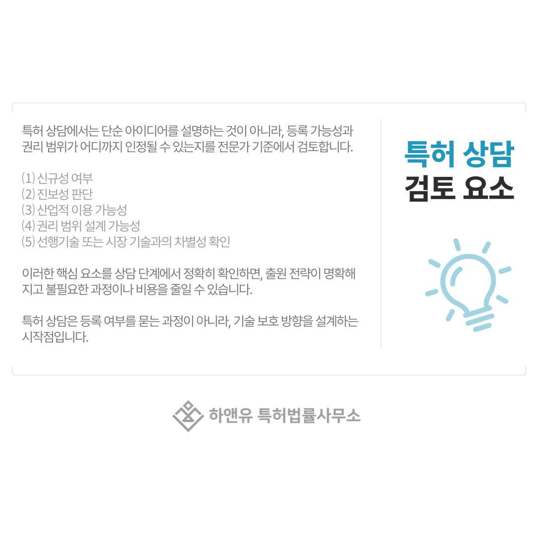 특허 상담은 등록 여부를 묻는 과정이 아니라, 기술 보호 방향을 설계하는 시작점입니다.