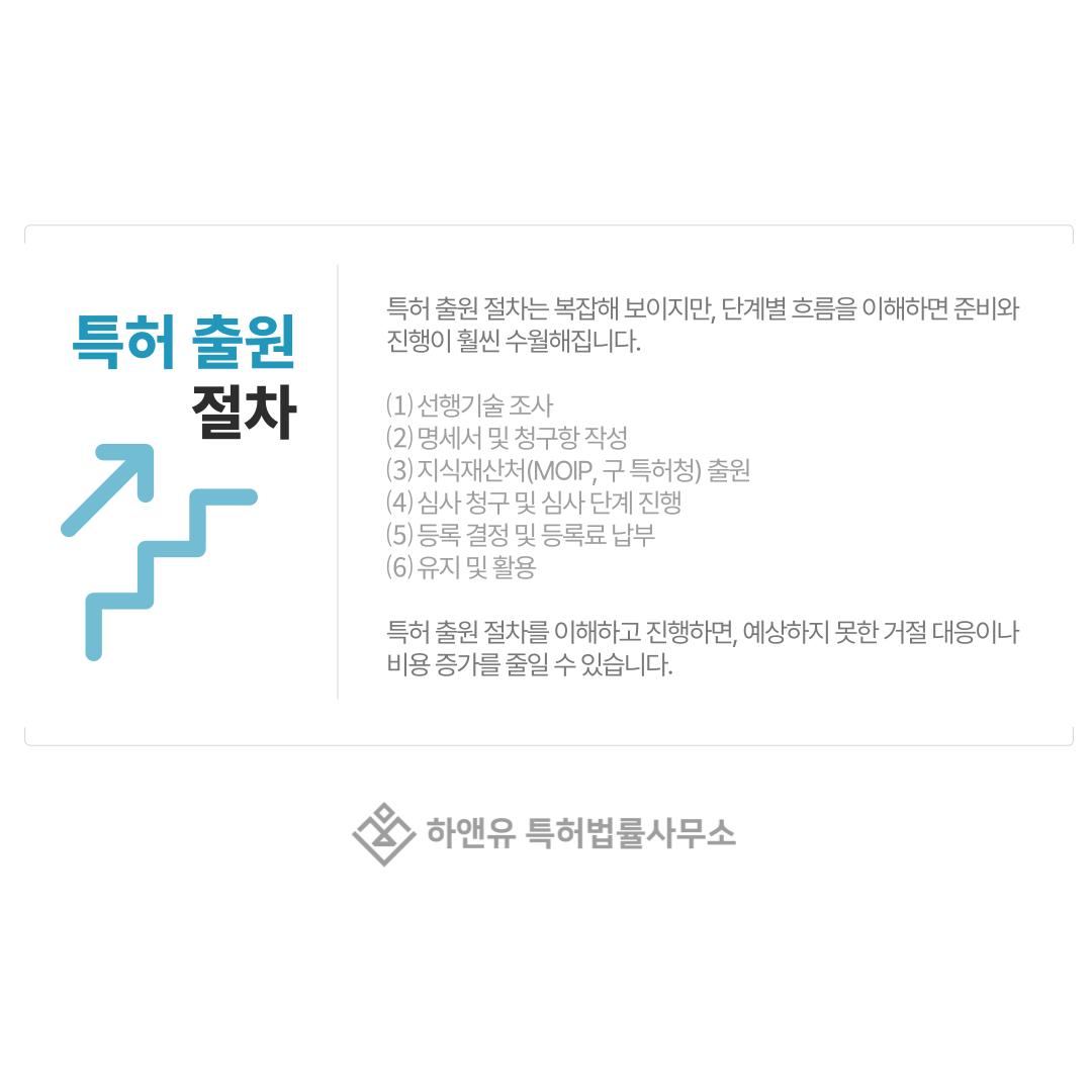 특허 출원 절차는 복잡해 보이지만, 단계별 흐름을 이해하면 준비와 진행이 훨씬 수월해집니다.