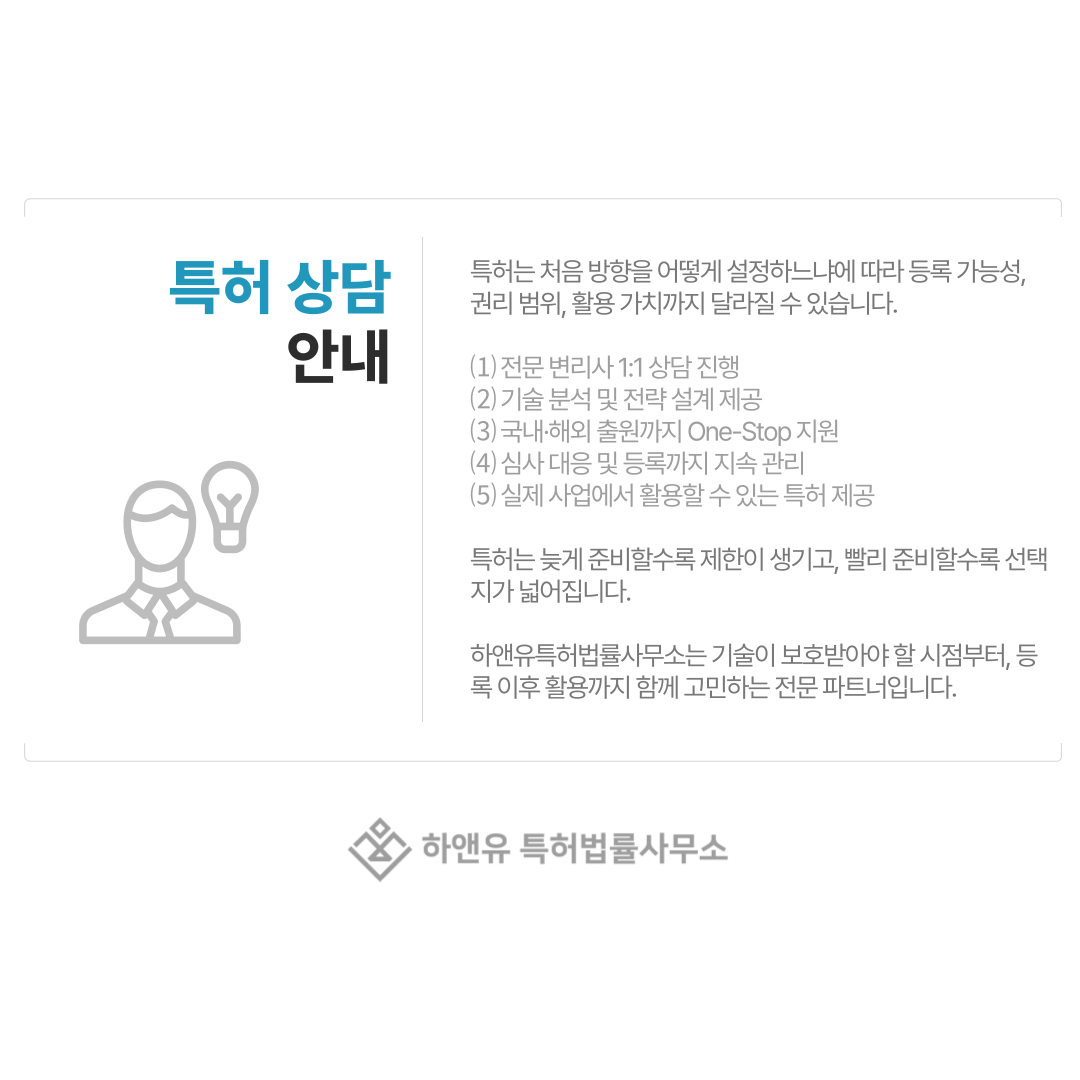 특허 상담은 어렵거나 부담스러운 과정이 아니라, 시간과 비용을 줄이고 등록 성공률을 높이기 위한 준비 단계입니다.