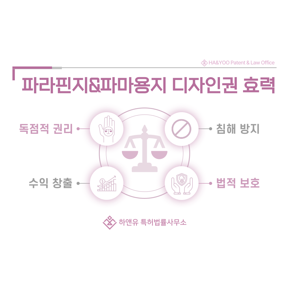 디자인권의 가장 중요한 효력 중 하나는 모방 제품을 막는 것입니다. 제3자가 등록된 파라핀지·파마용지 디자인과 유사한 제품을 제작하거나 유통하면 이는 침해에 해당합니다. 권리자는 침해자에게 경고장을 보내거나 법적 절차를 통해 판매 중단 및 손해배상을 청구할 수 있습니다. 이를 통해 불공정 경쟁을 예방하고 정당한 권리자의 이익을 보호할 수 있습니다.