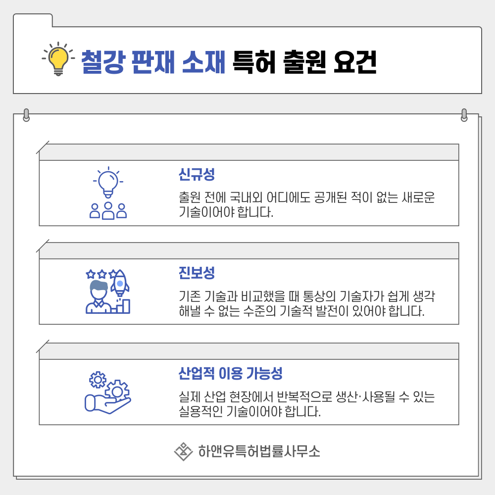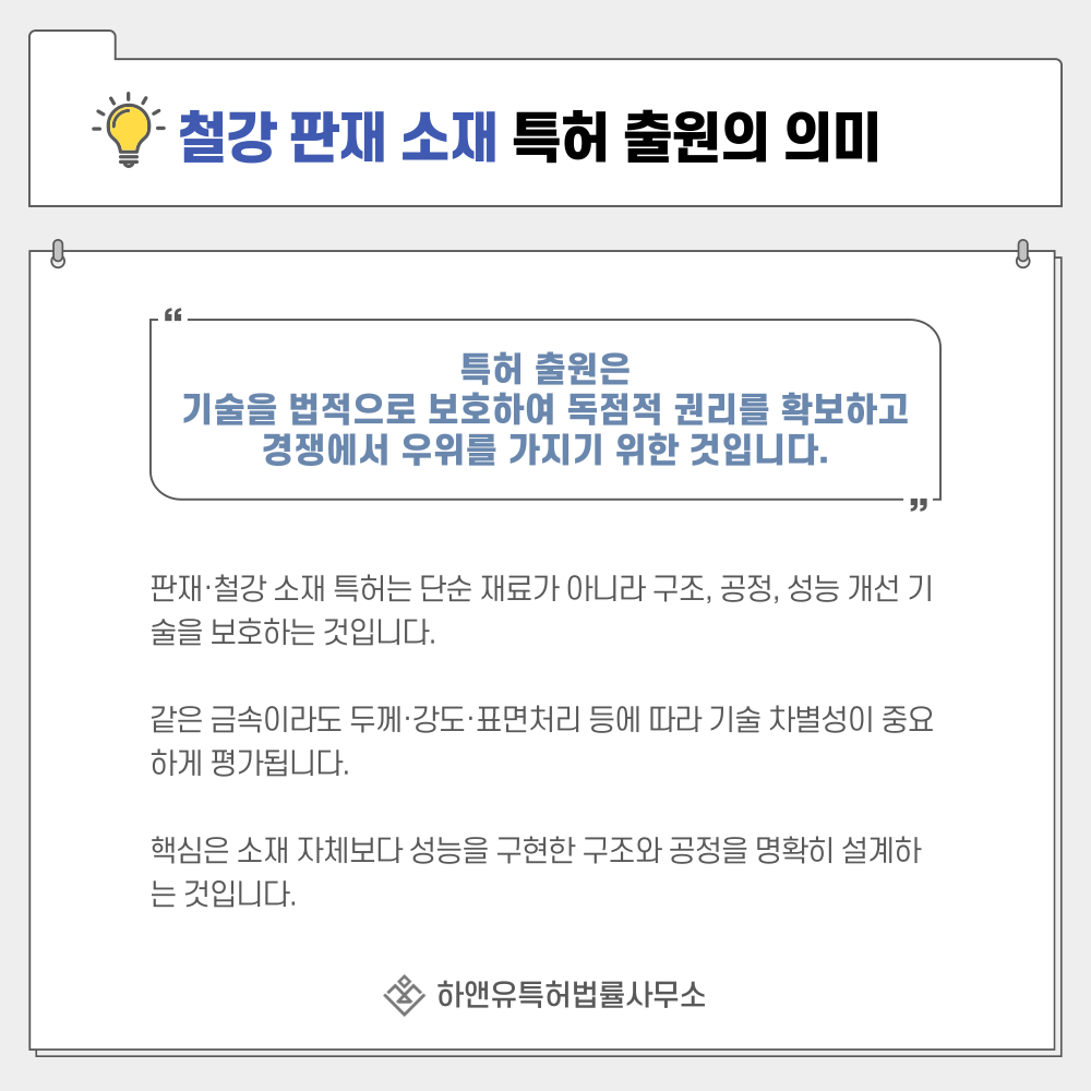 판재, 철강 소재, 금속 소재, 철판 스틸시트와 같은 소재 기술 특허 출원은 단순한 재료 등록이 아니라 가공 방식과 구조, 성질 개선 기술을 보호하는 과정입니다.