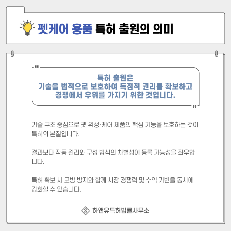 단순한 반려동물 제품 보호를 넘어 기능을 구현하는 기술 구조를 권리로 확보하는 과정입니다.