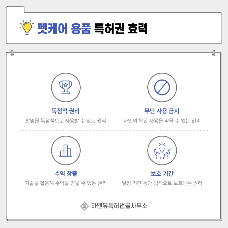 펫 위생용품, 배변 케어, 보충제, 매너용품, 그루밍 툴에 대한 특허권을 취득하면