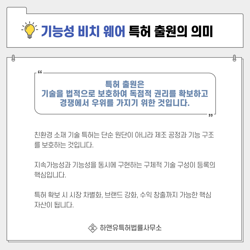 단순한 원단 사용이 아니라 소재의 제조 방식과 기능 구현 구조를 권리화하는 과정입니다.