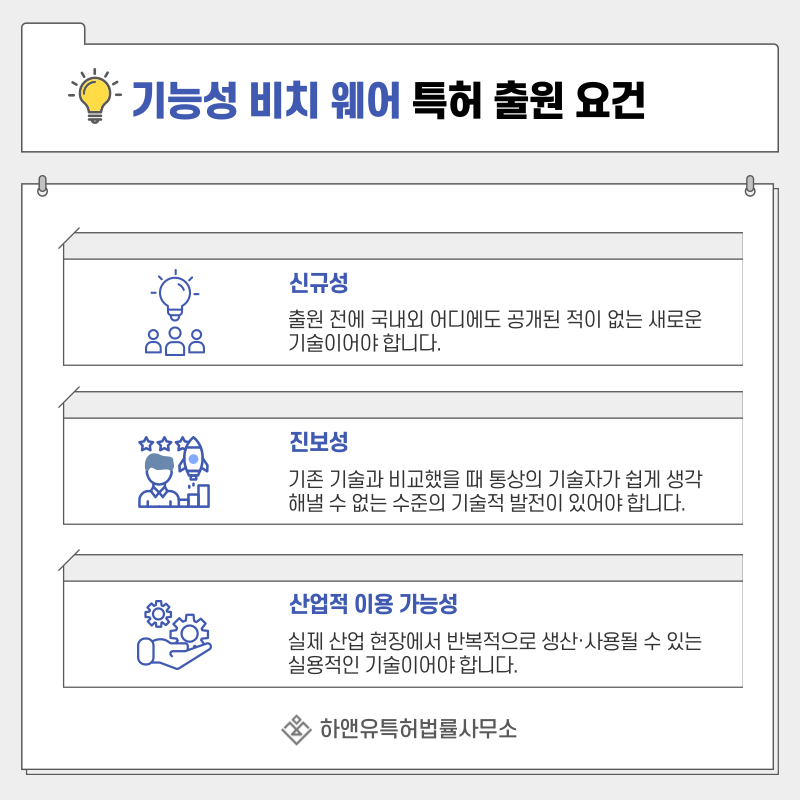 즉 신규성, 진보성, 산업적 이용 가능성을 기준으로 기존 기술과의 차별성과 기술적 가치가 검토됩니다.