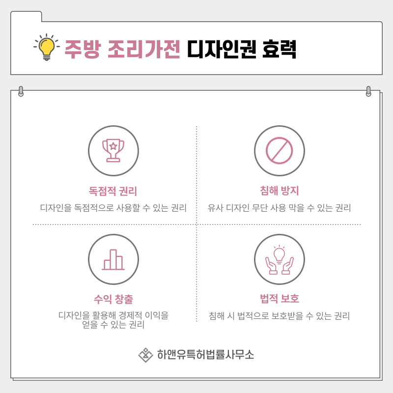 이처럼 디자인권은 시장에서 모방을 차단하는 가장 직접적인 보호 수단입니다.