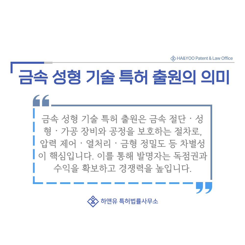 결국 특허는 금속 가공 산업에서 기술 차별화와 브랜드 경쟁력을 강화하는 핵심 전략이 됩니다.